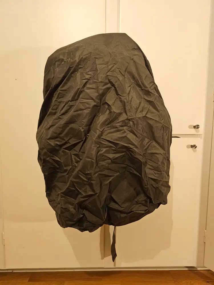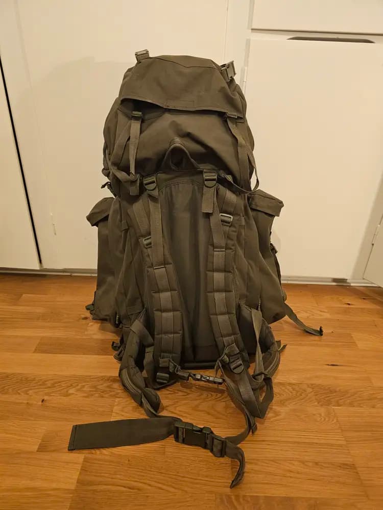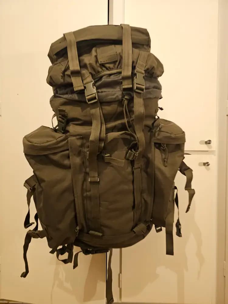 Gedigen ryggsäck med många fack och finesser. Sidofickorna är löstagbara via dragkedja, och går att sätta ihop till en daypack på 8+8=16L, då båda sidofickorna har en axelrem.Ryggsäcken har en aluminiumram för att stabilisera ryggsäcken, och ett ordentligt midjebälte för avlastning.Massor med fästpunkter på utsidan för liggunderlag, bössor och verktyg. I topplocket sitter även en ficka för det inbyggda regnskyddet som sitter fast i toppen, så det inte glider av i snårig skog.Defekterna är: en av dragsnörena till ena daypacken är av, och den andra daypacken saknar ett hanspänne för utvändes remmen. Funktionerna finns däremot kvar i ryggsäcken fullt ut.