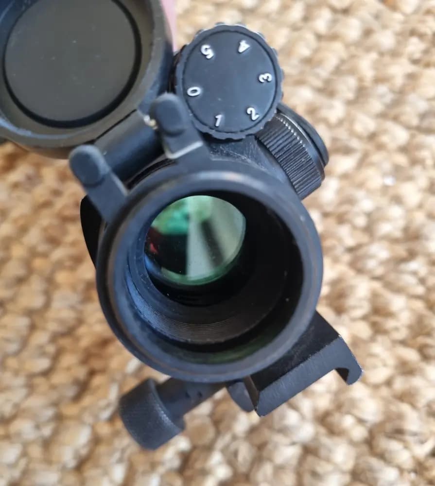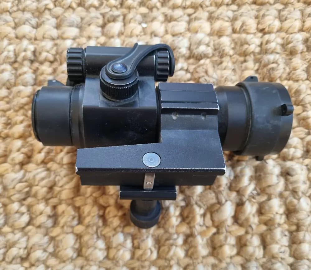 Ett repro-sikte som inte verkar fungera trots batterier i - kan behöva lite kärlek från en kunnig. Fästet som tillhör är äkta Aimpoint. Fästet går att fästa på alla airsofts med rails.