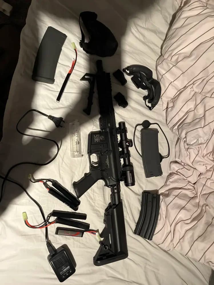 Säljer mina Airsoft grejer har inte så mycket tid längre till Airsoft, invader gear plate carrier 600kr cyber gun m4 full metal aeg med victo optics LPVO sikte och vapen väska3600kr 2 lipo och 2 nimh batterier med laddare 200kr en flaska kulor 50kr 3 magasin 300kr mask och skyddsglasögon 300kr Kan säljas separat, allt kan skickas förutom magasinen och vapnet köparen står för frakten, om man köper allt samtidigt så kan man få de för lite billigare