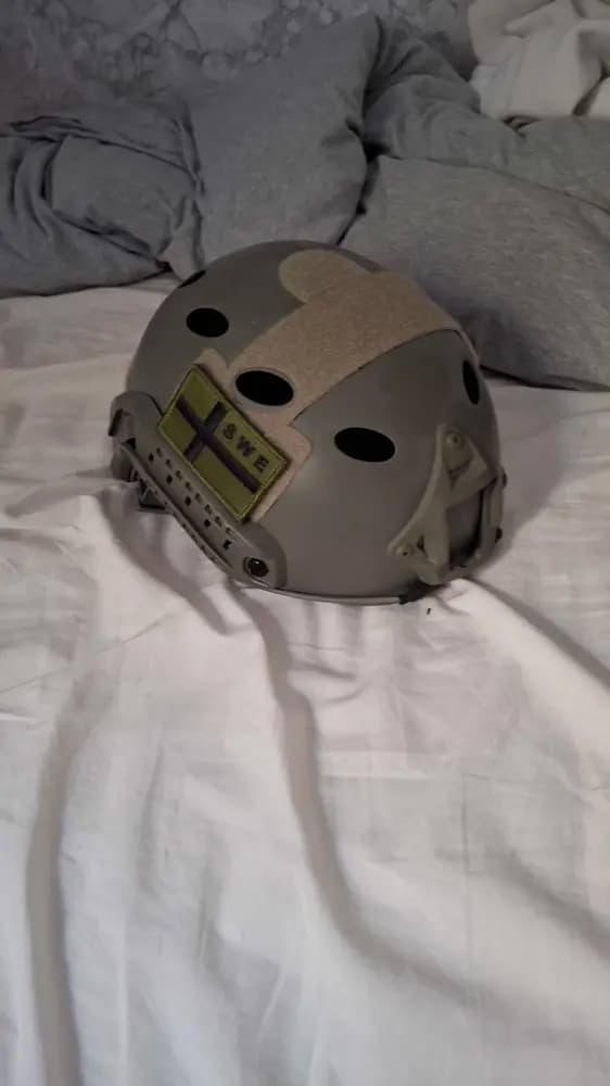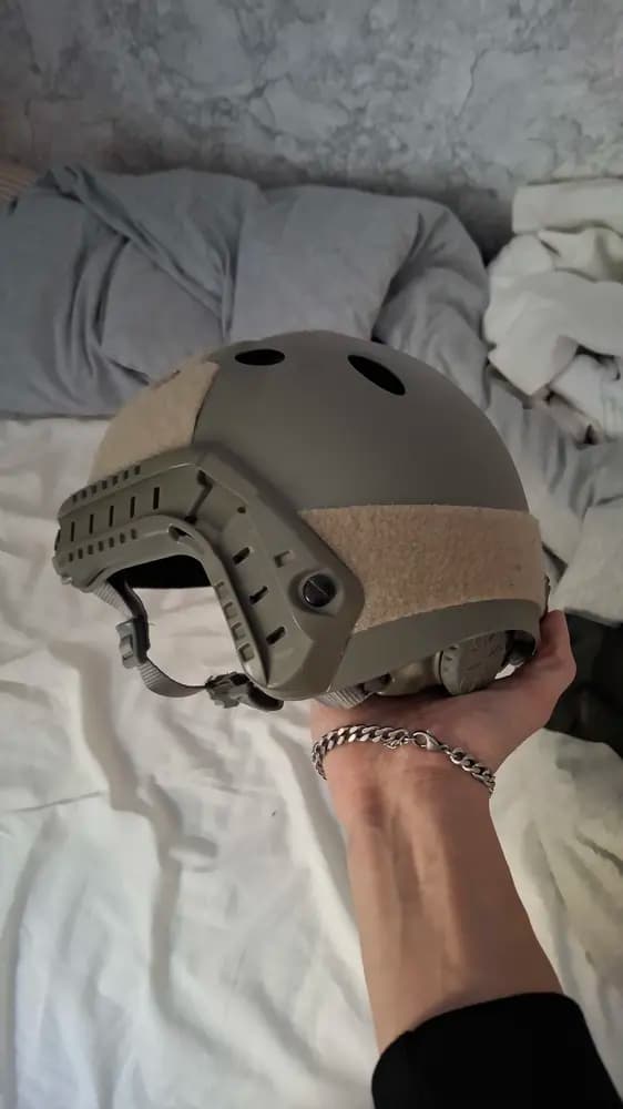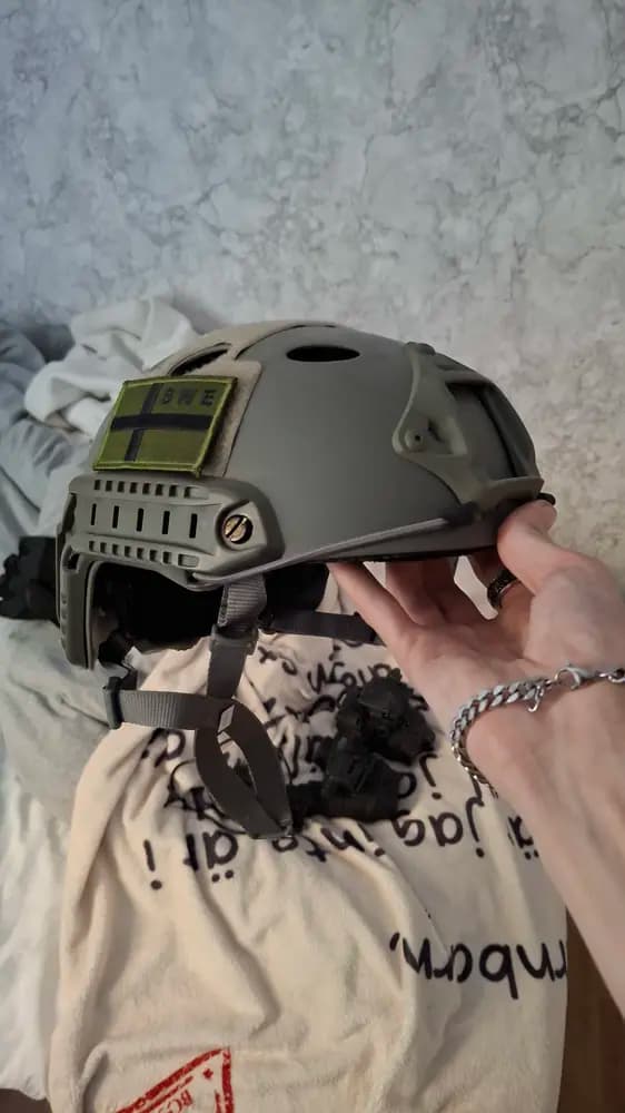 Tja, säljer en grön airsoft hjälm som har skjusterbar storlek.Bara att fråga om ni vill veta något mer!