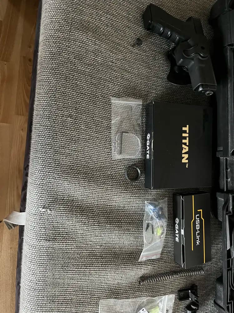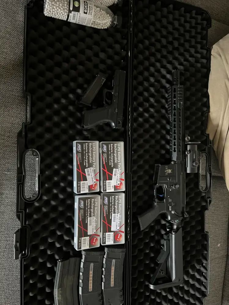 Då jag inte spelar airsoft längre är det dags att sälja av alla mina grejor.Vapnet är ett ASG devil M15 där jag har installerat en titan v2 mosfet. Med den kan du koppla upp vapnet till mobilen eller datorn och sedan programmera det utifrån vad du själv gillar osv. Sitter ett schysst röd punkts sikte som man kan ställa in styrka på samt röd eller grön punkt.Får även med en glock 18c som behöver lite kärlek. Skriv om fler bilder och om ni undrar något om den Följer med 6 midcap magasin 1,5 flaskor kulor ( 0.25g ) fin vapen väska där 1 av 4 knäppen har gått sönder men fungerar utmärkt ändå. 4 batterier 2, 7,4 volt och 2 11,4Sedan följer där även med lite annat diverse prylar ( kolla bilder ) Pris ej hugget i sten hör av er vid frågor passar inte priset lägg ett bud Mvh John
