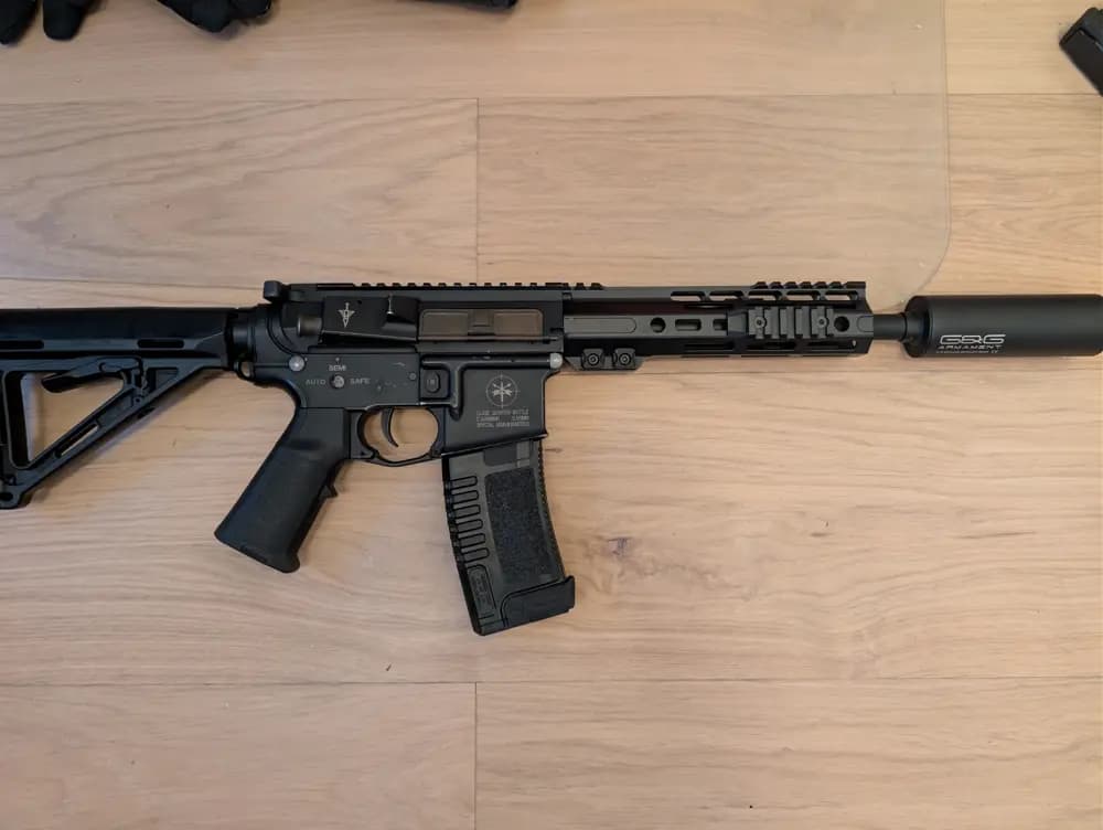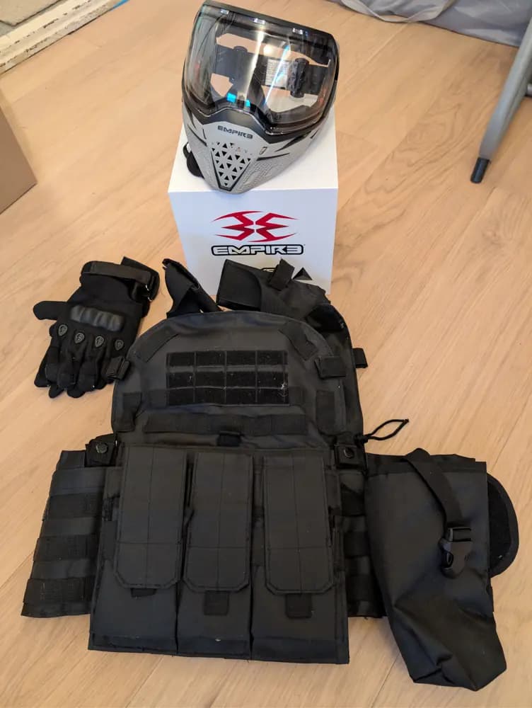 Ingår:Airsoftgevär M4/AR15 (AEG)RailsystemLjuddämpare/tracerJusterbar kolvFlera magasin 7stPlate carrier / taktisk väst med magasin- och utilityfickorEmpire helmask (paintball/airsoft)VapenväskaBatterier + laddareSling/remSkyddshandskar x2BBsÖvriga tillbehör enligt bildSkick:Begagnat men väl omhändertagetAllt fungerar som det ska.