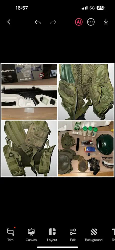 Säljer alla mina airsoft saker som paketM4 karbin med rödpunktssikte och 5st plast magasin och ett metall. Drivs på el, batterierna kan vara döda
