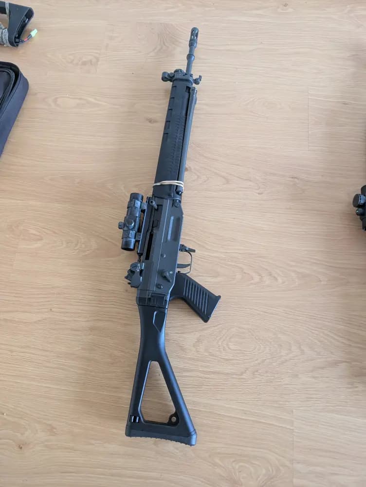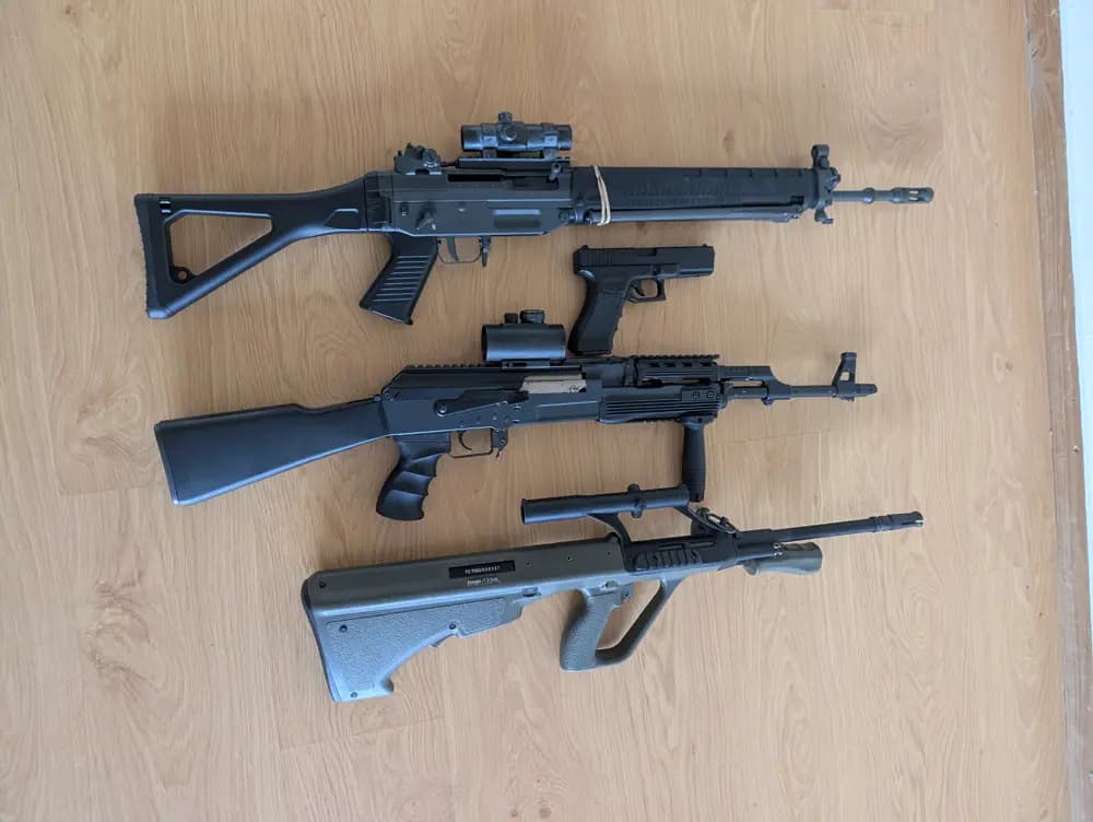 Paket eller enskilt Aug en är i stort sett helt oanvänd lite lätt uppgraderad med en MOSFET och en spärr på avtryckaren för att blockera full auto värde 2500kr skicka med två midcaps och ett high cap magAkn är i befintligt skick fungerar och skjuter utan problem kopen och pippan är i full metal den skulle behöva ett nytt charging handle värd 1700kr skickar med några high cap mag Sig 550 1500kr endast test skjuten skickar med ett high cap mag Gock AEP 1000kr aldrig använd skicka med ett batteri och usb laddare till Skickar allt i ett för 6000kr eller för priserna ovan Om paketet hämtas på plats får så får du det för 5000krKan skicka