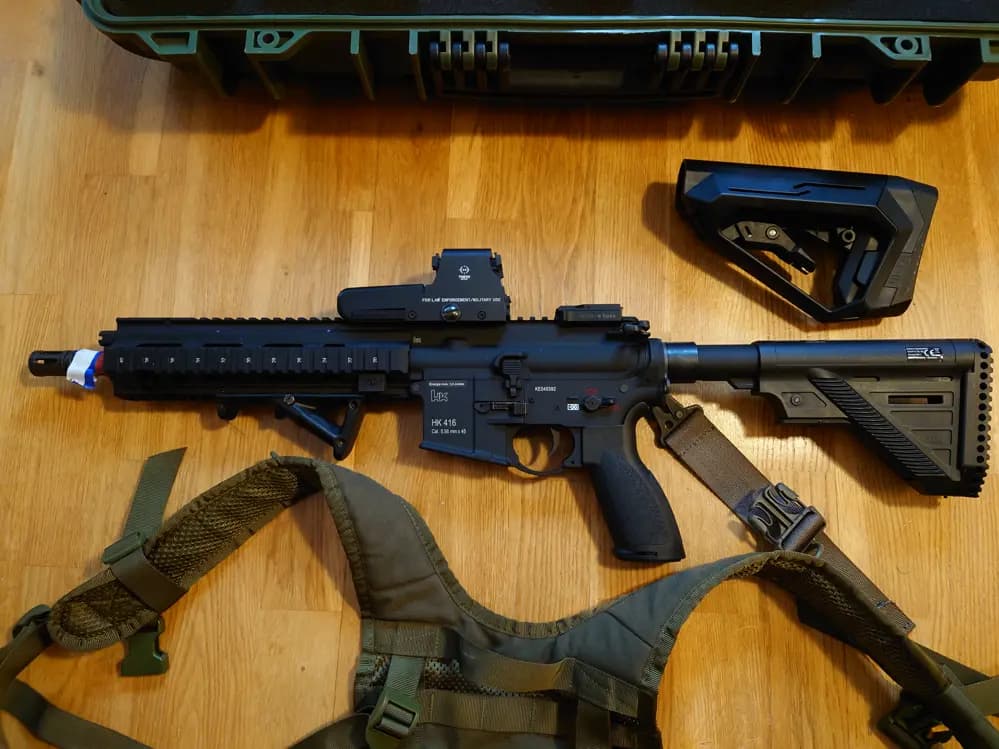 Ett superkit!Perfekt för dig som vill gå från mjukisninja till tacticool på en gång!Jag säljer nu hela min airsoftarsenal då jag inte längre har tid då jag gift mig och driver ett hushåll och börjat glida över i brädspel istället.*I kittet ingår kläder i storlek medium, så har du samma kroppstyp som jag 65 kg längd 179 cm så kommer det sitta som en smäck!*Komplett Stridsväst 12 storlek liten.*HK 416 original (CQB) med extra stock för mer batterikapacitet.*FN Herstal P90 (Modifierad till CQB)*Tokyo Marui Glock 17 GBB (CQB) Gasmagasinen läcker i ventilen efter lång förvaring.*Tokyo Marui Glock 18 AEP (CQB)En mängd väskor kulor i olika vikter gröngas magasin till allt samt ett flertal LiPo batterier, LiPo-pal, Chronograf CO2 patroner, Knallskottsgranater.Jag tar helst på upphämtning då det är så mycket grejjer och allt ska bort helst på en gång!