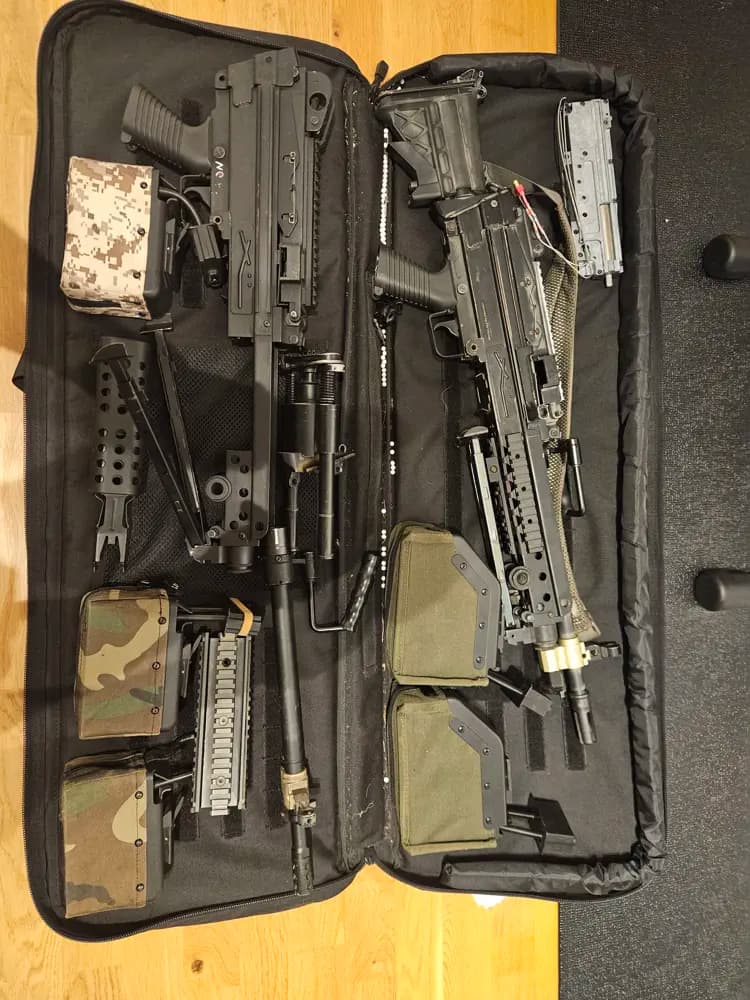 Säljer min m249 då den mest ligger och inte används.I grunden en a&k mk46.Genomgången vid köp och aldrig krånglat under min ägo, mer än att jag fått byta en microswitch efter ett par år.Allt på bilden ingår. Dem stora magasinen funkar Osäker på funktion på dem mindre, I detta packet ingår delar för att i princip bygga ihop en till m249.Kan naturligtvis skickas med då står köparen för frakt osv.Intresserad, bara att fråga på.Priset är satt så någon annan kan få nytta av den.