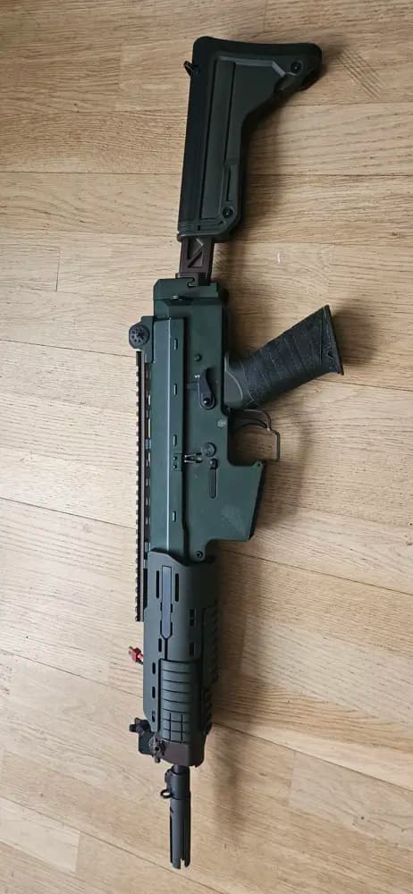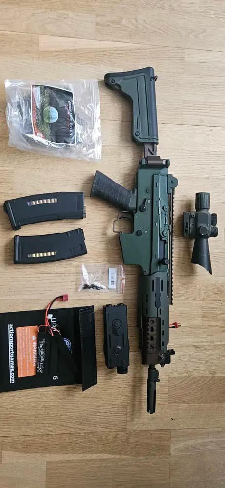 Säljer nu min älskade Ak5d som har varit med mig ett bra tag och varit min workhorse. Funkar utan problem skjuter rakt hårt och bra. Bolt release knappen gick sönder av vanligt slitage men får med en ny bolt release sats.Man får med 1 nun-chuck lipo 11,1v 1100mAH batteri, 2st mid cap magasin, batteri hållare och ett sikte som har inbyggd laser och har 2 modes av färg i siktet röd och grön, sen får man med 0,28g bio kullor som snart dock e slut.Har ni flera frågor så är det bara skriva till mig så svarar jag så fort jag kan:) pris kan diskuteras