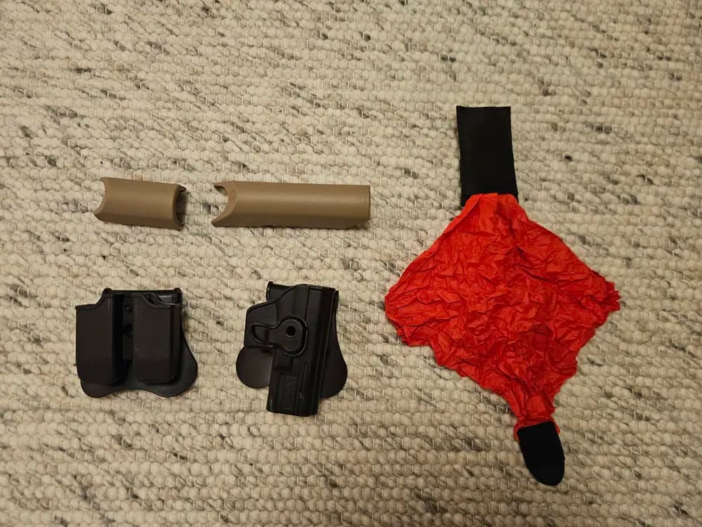Hölster och magasinfickor passar ex. WE glock 17. Två cheek risers för m4 stock, bra om man kör en riser på rödpunkten.deadrag som går att fästa i molle för snabb användning