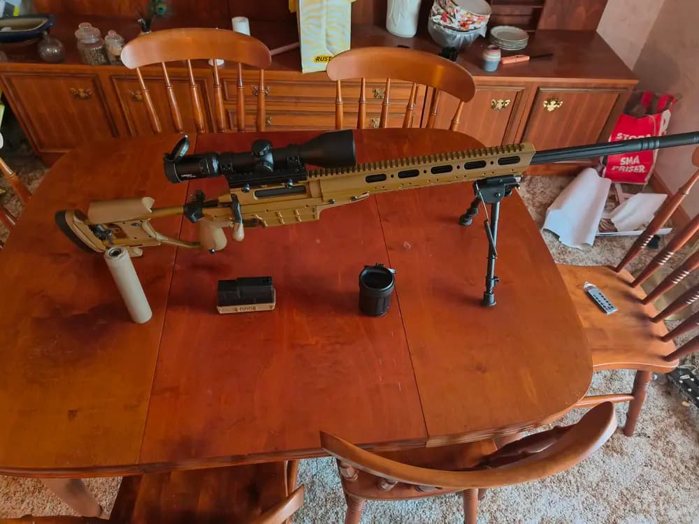 TRG M10 i mycket fint skick.Allting fungerar som den ska, skjuter ca 120m/s med 0.45 bbs.Ett magasin, bipod och ljuddämpare ingår.Siktet kostar 1500 om man vill köpa med det.Finns små repor på pipan samt runt bolten.Hör av dig om du har några frågor.