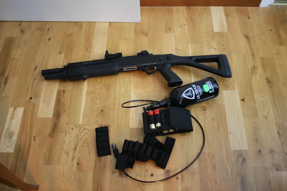 Co2 hagel med mod för HPA.12st "mag" Nypris st är ca 160-130.Nypris hagel ca 3600krUltrair HPA tank 0,8l (48ci) 3000psi aluminium nypris ca 950krPraktiska fickor medföljer, en med kardborre, en med fäste runt arm och en med molle fäste.Siktet fungerar branutan skador (okänt märke från wish) Texten nedan är från TacticalstoreThe STF/12 is considered the best shotgun on the market, due to its manufacturing quality, performance and look.Features:Metal bodyRemovable sights includedRetractable stockFiring mode: SAFE, 3 BB's, 6 BB'sEnergy 0.9 joulesPicatinny rail on the upper and under the pumpOfficial MarkingsWorks with 30BB's capacity cartridges which provides 10 shotsStrap attachmentLength: 830mmWeight: 3.8 KgByten kan vara av intresse. Frakt kan ordnas om man vill.