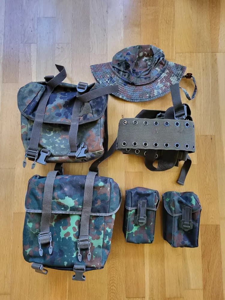 Bw Tragesatz med 5 delar. En större väska(mehrzwecktasche) samt 2 magasinfickor (G3), bälte och hängslen. Surplus grejer, så det är saker som använts i fält. Allt är dock helt och fullt funktionellt. Magasinfickorna är som nya.Har en extra mehrzwecktasche samt en äkta Bw boonie i flecktarn.Säljer helst allt på en gång. Pris kan diskuteras.