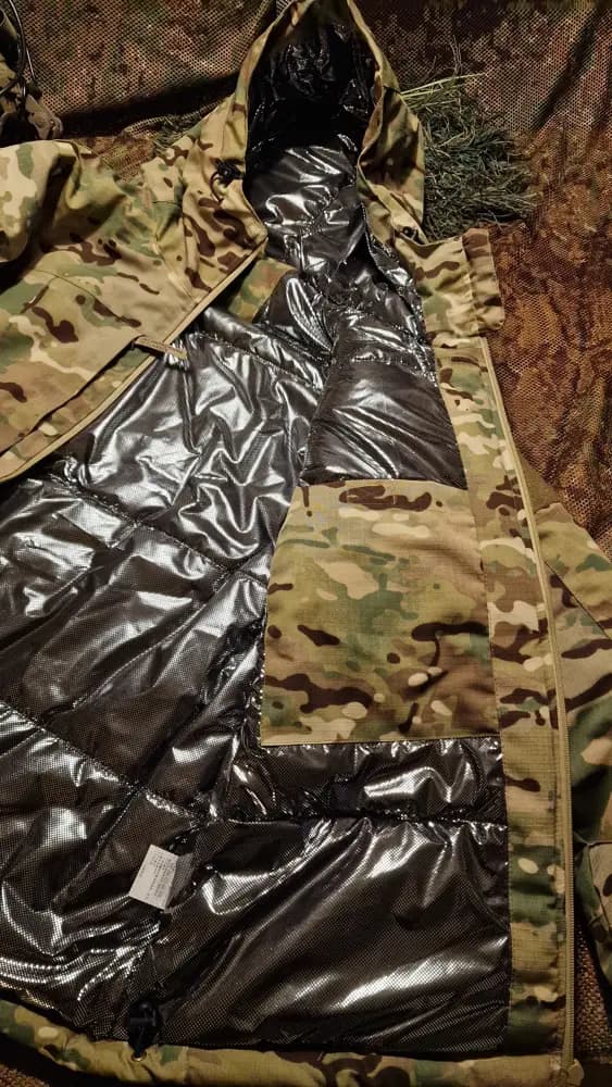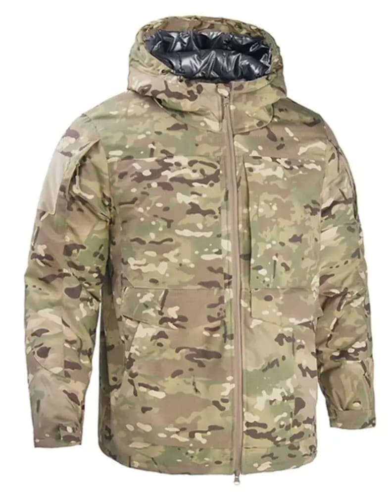 Jacka i kamouflagemönster med dragkedja framtill och justerbar huva. Jackan har flera fickor framtill och justerbara ärmslut med kardborreband. Reflective värm/ vindtät/ vattentät. Storlek L/XL/XXL. Fråga vilken storlek är du intressera.