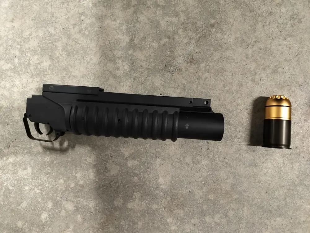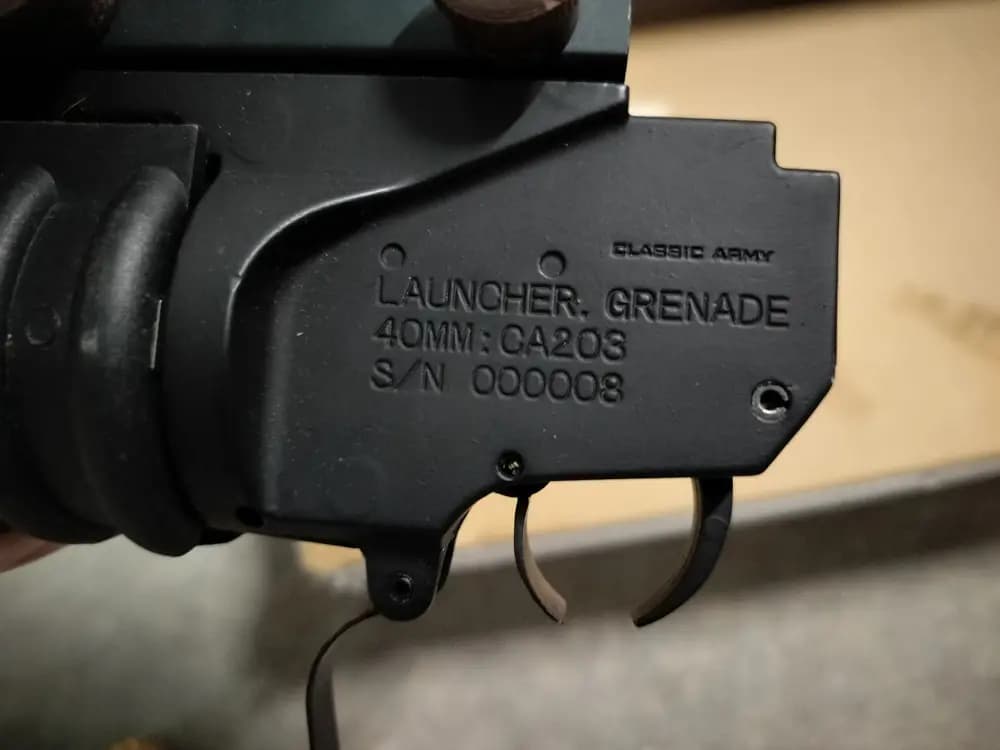 Picatiny monterad granatkastare med en inkluderad gasdriven 40mm granat. Fint skick och knappt använd, endast lite rostig på spänn skruvarna. Svårt att hitta nypris på den, men jag betalade runt 1200sek för endast M203:an.