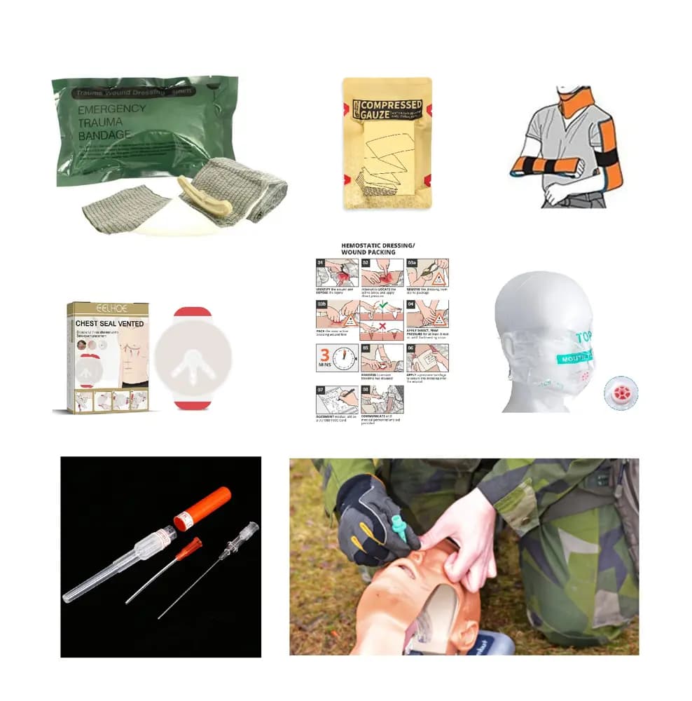 Trauma Bandage / Combat Gauze, 6-Ply / Nasopharyngeal (S) / Decompression Needle / 3 x Chest Seal Vented / 2 x Suturset / Splint Roll / Combine Pad 22.9 x 12.7 cm / Adhesive Dressing 10 x 6 cm / PBT Bandage 4.5 m x 5 cm / Självhäftande sportbandage / 2 x SQR plåster / 2 x Camo plåster / SteriStrip ( Sårkantsfixering ) / 2 x Sterilsavett / BurnGel 3.5 g / Emergency Blanket 2.1 x 1.3 m / EMT Shears / Saxficka / Face Shield ( Key Ring ) / Gloves / Emergency Manual
