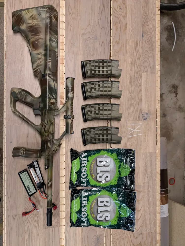 Jing Gong Aug som är CQB "trimmad" uppgraderad med mosfet för att kunna köra 11.1 Lipo batteri, ligger på ca 0,92 Joule på 032 kulor, låst i Semi Auto, tyvärr är fire Selectorn borta. Skickar med 2st 7,4 Lipo och två påsar oöppnade 0,32 kulor och 4st magasin. Allt säljes i samma paket.