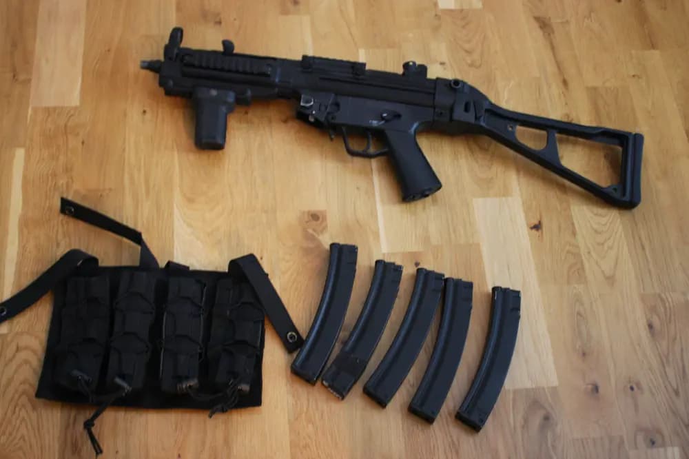 Det är i använt skick, fickorna på bild kan fås med om man vill.4st high cap magasin och 1st mid cap.Byten kan vara av intresse.Frakt kan ordnas om man vill.