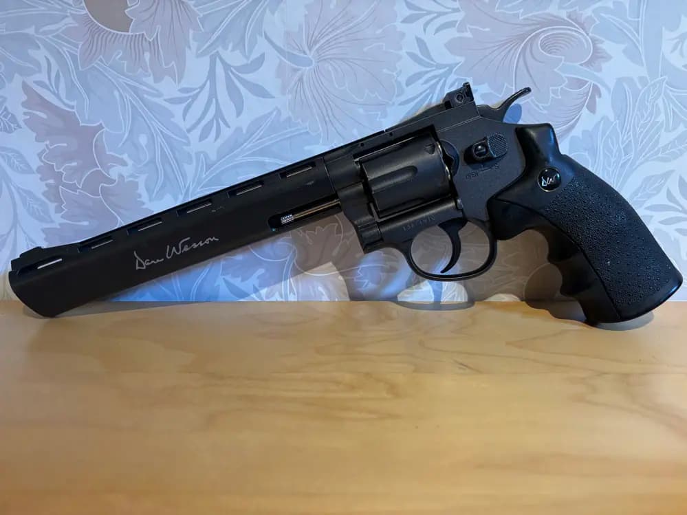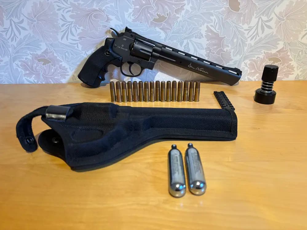 Mäktig revolver med totalt 22st patroner, ett hölster, rail för att montera sikte och en snabbladdare som funkar skitdåligt.
