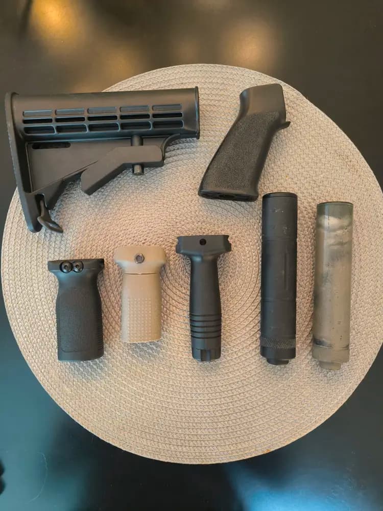 Stock 150kr.Pistolgrepp 100kr.Frontgrips 100kr stycket (alla picatinny).Dämpare fyllda 150kr stycket.