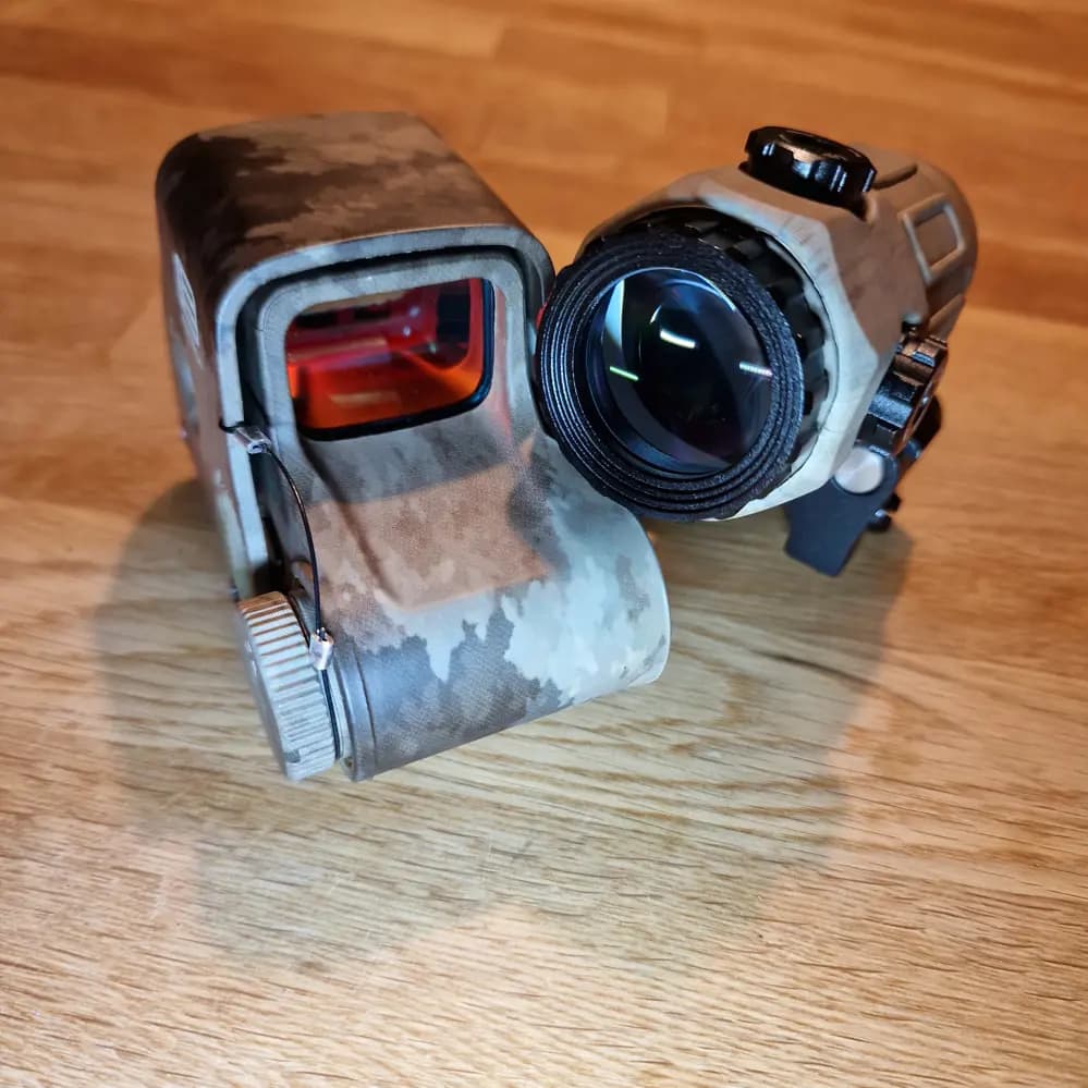 Repro Eotech G558 +G45 i camouflage. 558 Holographic weapon sight with 68MOA ring and 1 MOA dot reticle.Holographic Hybrid Sight Includes 558 sight with G45 Magnifier.Quick Transitions - Change quickly from close quarter ta medium range targets with the included G45 Magnifier with Quick Side Button Operation - Compact design and side buttor operation consumes minimal rail space Included the Quick Detach lever, fits 20mm Picatinny Weaver and MIL-STD 1913 Rails, g558 Holographic Optical SightThe 558 holographic optical red dot is an excellent choice for professionals. The 558 offers true two eves open shooting for fast target acquisition.