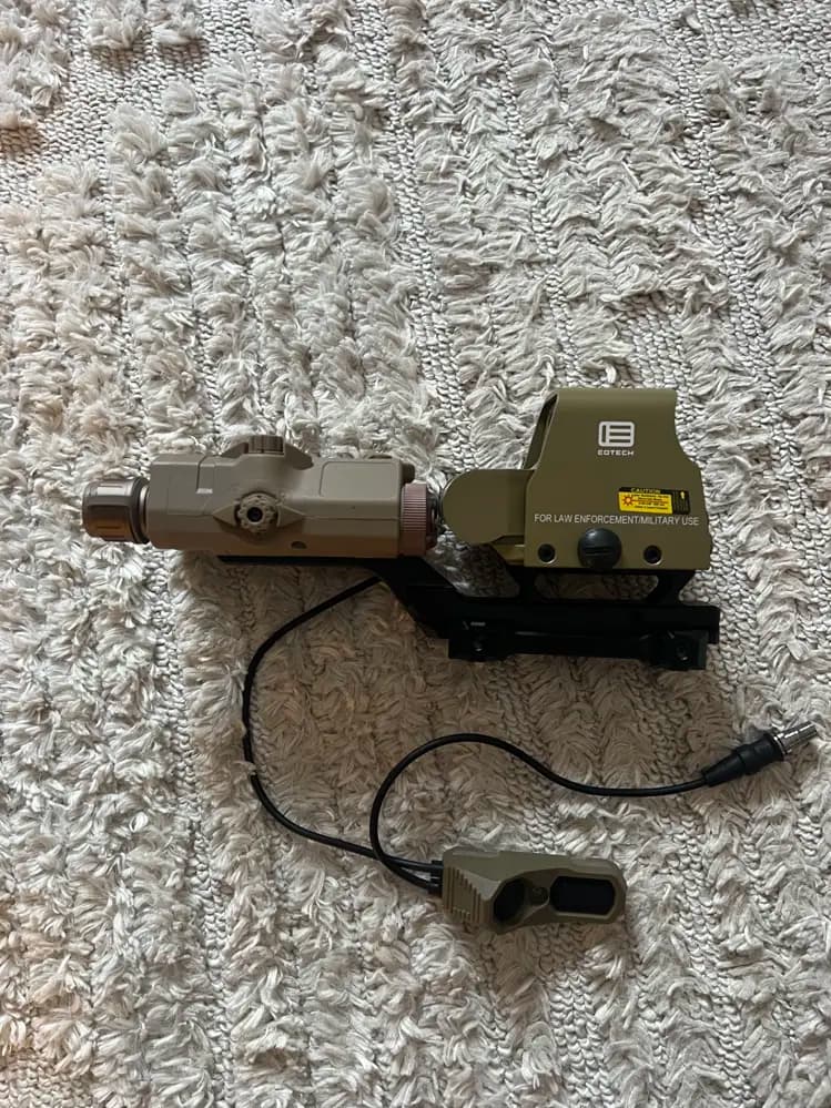 Köpt nytt sikte så säljer av detta som ett kitt. Eotech 553 repro, peq15, riser samt en dualknapp som man även kopplar in till en ficklampagrejorna har aldrig sett spel utan bara varit testmomterade hemma. peq har röd laser, ficklampa, ir laserhämtas i skövde eller skickas på köparens bekostnad
