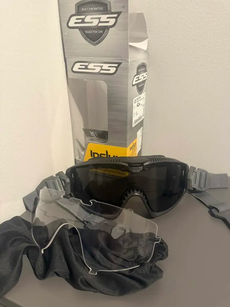 Det här är äkta ESS-goggles, Väldigt bra. Jag har haft dem i ungefär sex månader, men de har bara använts ett fåtal gånger, så de är praktiskt taget helt nya. Inga repor eller skador på linserna, både svarta och klara. De immar praktisk inte tack vare stor ventilationssystemet. De passar perfekt om du vill ha en cool hjälmuppsättning.Gummit är mjukt och anpassar sig enkelt till alla ansikten. Jag hade det problemet med andra billiga goggles som inte passade riktigt på mitt ansikte, dom här har inte det problemet. Jag säljer dem eftersom jag gör mig av med hjälmen och byter till skyddsglasögon. Jag skickar den med alla tillbehör jag fick och originalkartongen.