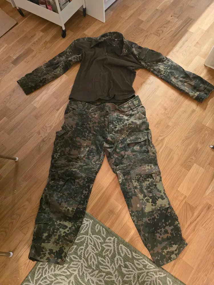 Flecktarn byxor i XL och combatshirt i L, båda från invadergear.Byxorna har ett litet hål vid vänster benficka. Inga knäskydd finns kvar. Hålet kan sys igen innan köp men jag är ingen expert så lovar inget 10 av 10 resultat. Kan skickas mot att köparen står för frakten. Annars hämtas i Umeå.