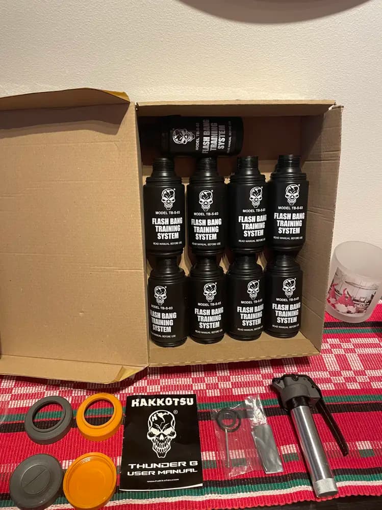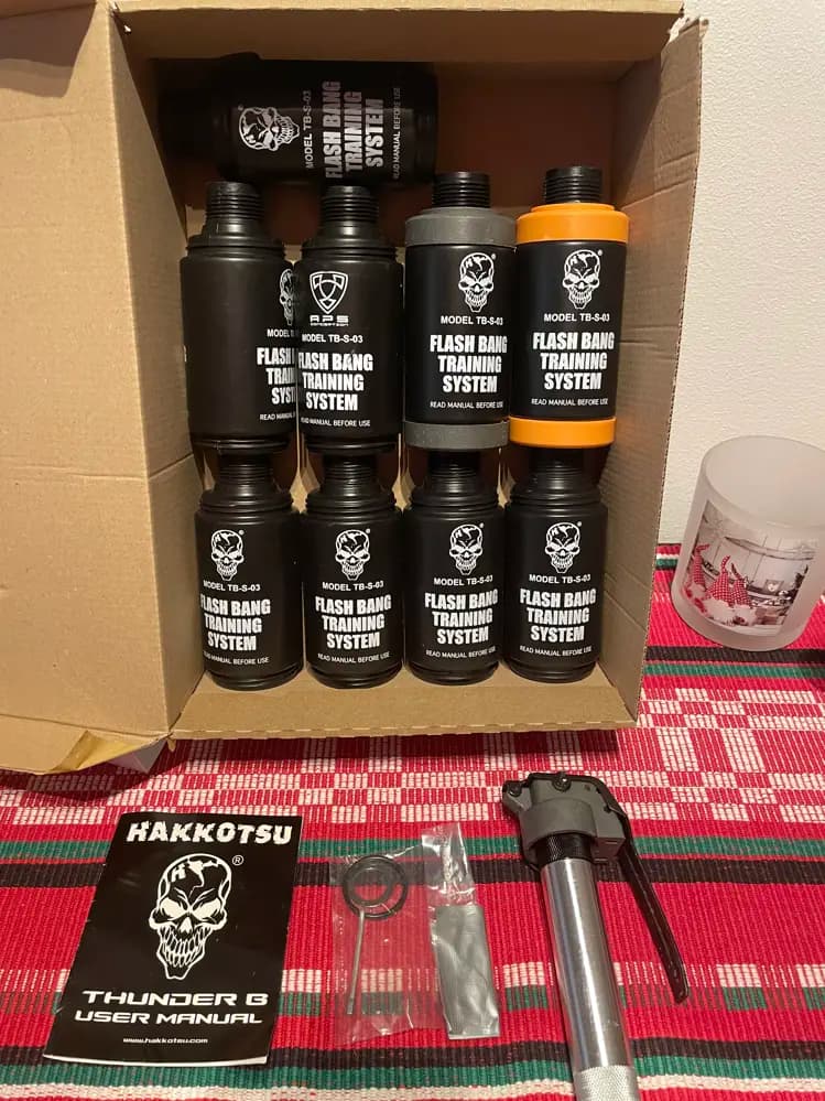 Säljer ett komplett airsoft flash bang träningssystem. Inkluderar 9 st skal, en Thunder B granat, tillbehör/reservdelar och manual. Airsoft, milsim, skott träning, övning. Kolsyrepatroner ingår ej.
