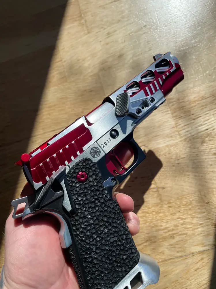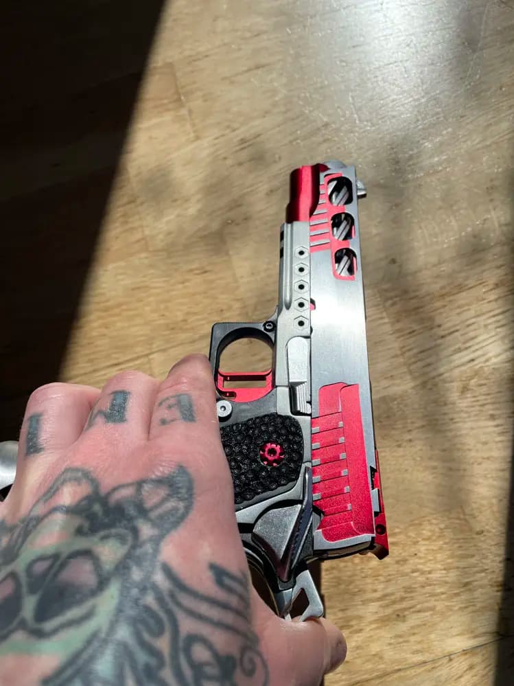 Hi-Capa bygge.Slide: Gunsmith Bro's Ultra Cut. Charging Handle: 5kU. Ytterpipa: 5kU. BBU: CowCow. Nozzle: Edge Customs Long Legs + 180% fjäder. HopUp: Maple Leaf med ML CrazyJet Innerpipa. RecoilSpring: AIP 140%. ThumbRest: AIP. Frame: modifierad AW. Interna delar TM. Trigger: Edge Customs. Grepp: TM orginal som jag stripplat med LA Capa grepp skruvar. Magwell: CTM-Tac.har du frågor så fråga på! köparen står för frakten! Avhämtning fungerar också.
