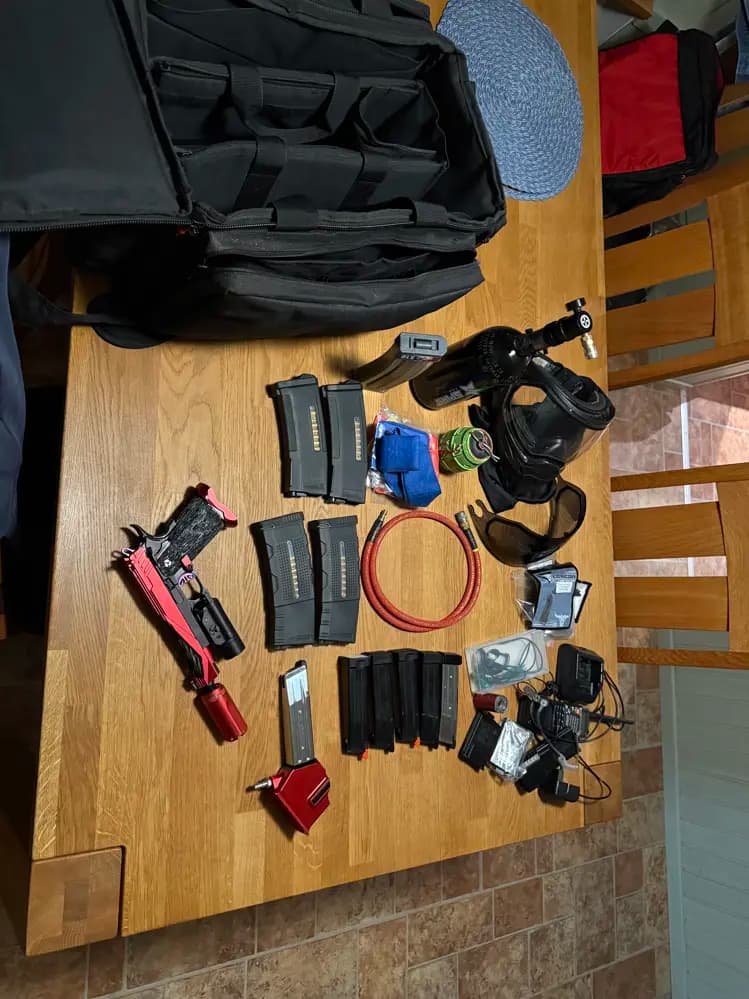 Säljer mitt speed soft kittUppgrad TOKYO MARUI 5.1 Hpa flask, reg, slang o monkadapter. Vapen lampa med röd lins. m4 magg 4st och 5 gasmagg. Storm grat, Baofeng c-radio med extra batteri o laddare , traseer (acetech)& T238, Empire mask med mörkt o klart glas, vapen/ transport väska.tillsammans med en asgrym nyservad. TOKYO MARUI 5.1 köparen står för frakt
