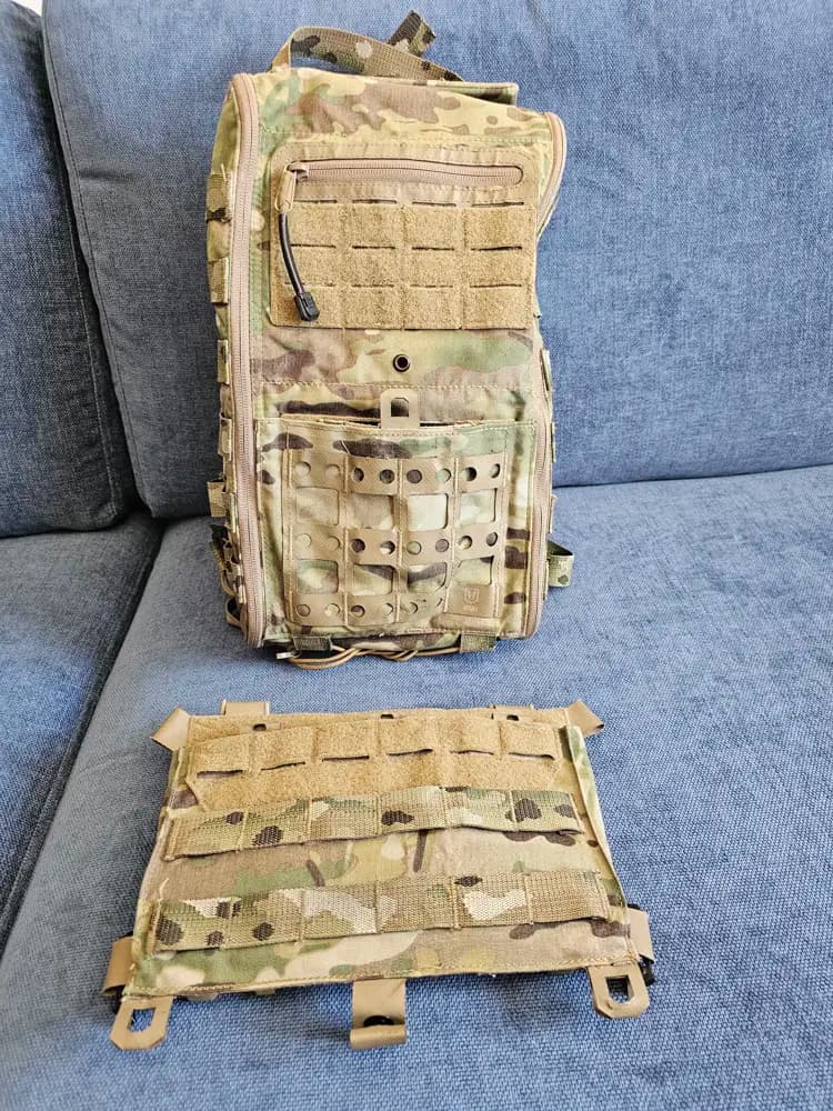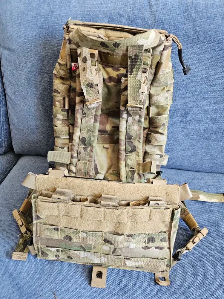 Säljer en väska med frontpanel i multicam från husar.Går att använda som enbart ryggsäck eller sätta dit frontpanelen och ha den som enklare chestrigFinns i Norrköping