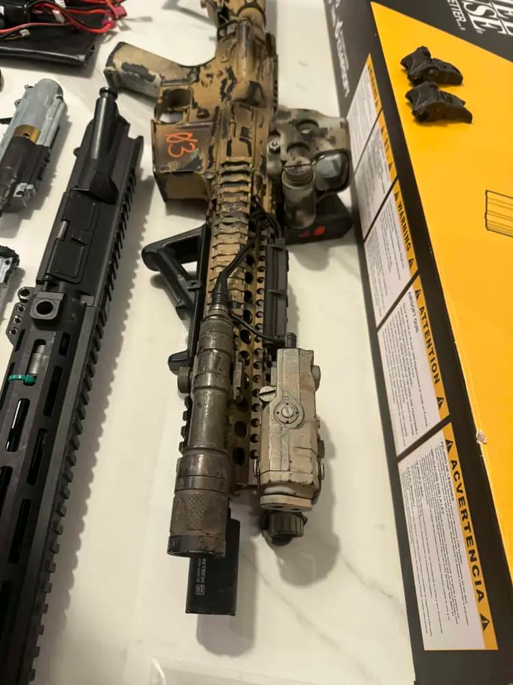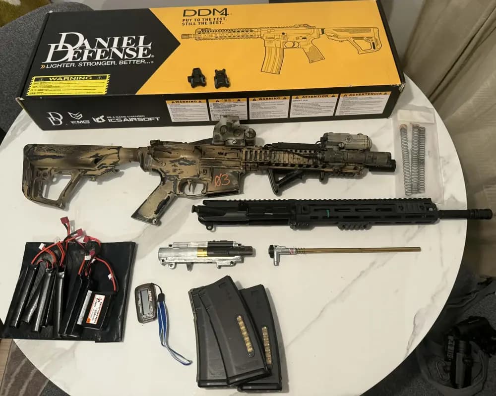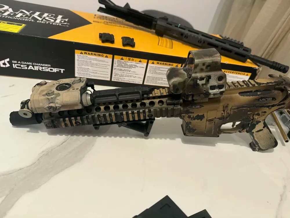 Säljer en ICS MK18, med två hela uppers, alltså en extra upper gearbox och pipa.På bössan sitter det ett holy warrior Eotech med NVG läge, en PEQbox med IR laser, vanlig laser och vanlig lampa, en extra vapenlampa surefirekopia med riktigt starks ljus och en dubbel pressure switch.till bössan kommer det med:Xcortech tracer enhet.6st mid caps magasin.3st extra fjädrar för att få bössan att skjuta i CQB, Assault och DMR enligt 2020tabellen.5st 11.1v lipo batteri, en lipopal.Allt du ser på bilden får du med.