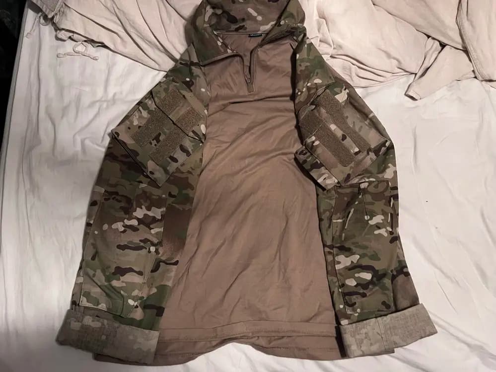 En combatshirt i multicam som är lite för stor på mig storlek L fantastiskt bra och väldigt fin knappt användDen har även armbågspadingköparen står för frakten