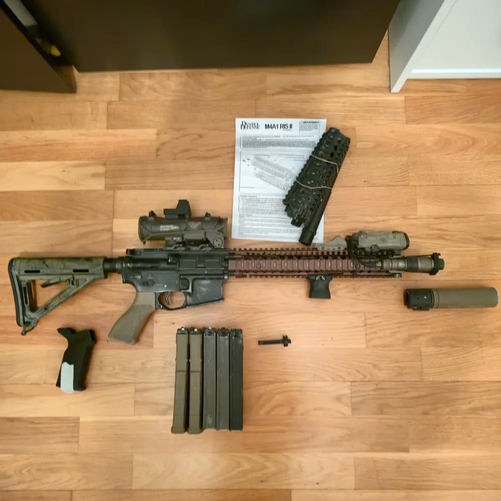 Den levereras med två olika handskydd och outer barrel. Den kommer också med 5 working magazines och några extra som behöver fixas lite. Alla 5 working mags har "Top how springs" och jag har två extra fjädrar.