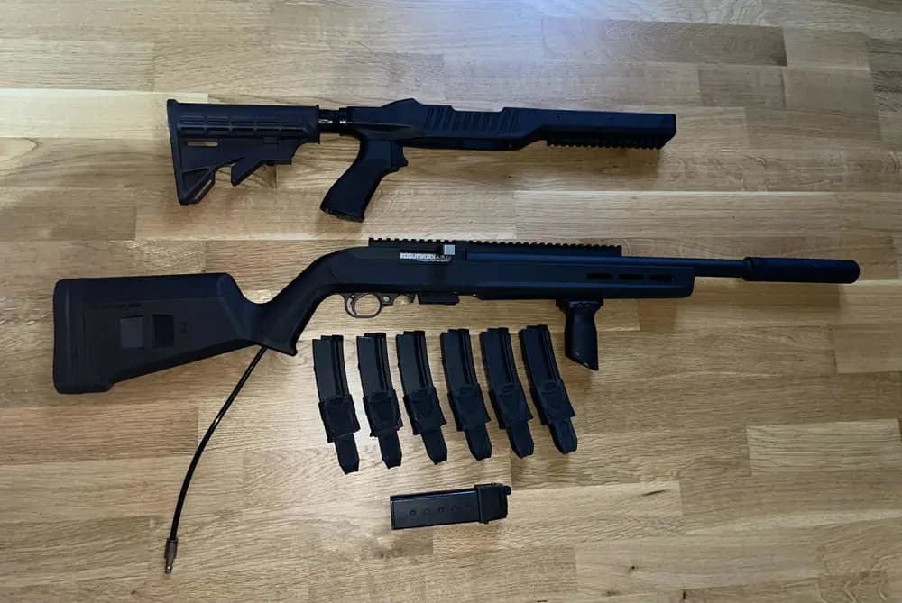 Magpul Hunter X-22 stock - moddad så att HPA slangen kommer ut vid greppet