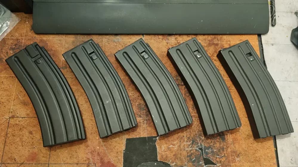 Fyra stycken M4 magasin och ett 416. Båda fungerar i både M4 och 416.