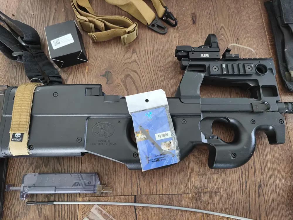 P90 King ArmsAEG med 9,6V NiHM batteri, laddare finns. Oklart skick på batteri då den ej är använd på flera år.6 Magasin varav ett Hi-Cap, snabbladdare finns."Kinasikte" sitter på med extra skydd, finns även gult kontrastfritt glas.Två vapenremmar.Ny cut-off lever köptes precis när jag slutade spela. Ej installerad. Skjuter dubbelt ibland vid single-fire.M90 fjäder installerad för CQB. Originalfjäder finns kvar, okänd styrka.4 fickor för dubbla magasin varav ett fästes på benet.Finns i Västerås