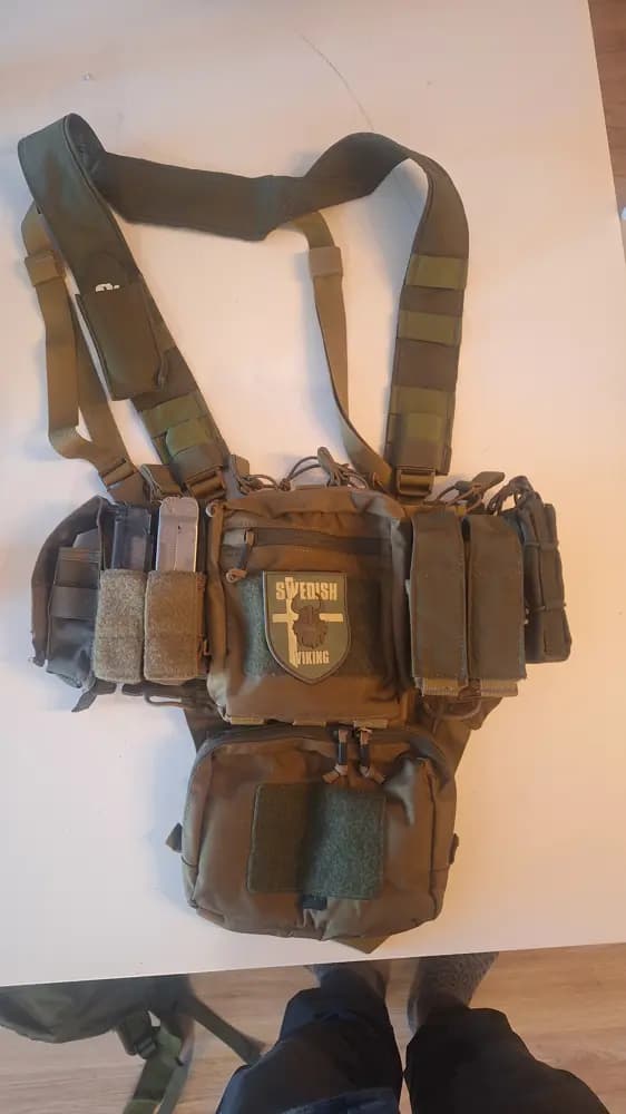 En helikon-tex training mini rigLätt och bekväm liten chestrig.Fickor för allt du behöver för en dag ute i skogen. 4 st m4 magasinfickor, 4 st pistolfickor. 1 st granatficka och en radioficka. 2 st störrefickor för tex godis och extra batterier. Använd senast sommaren 2023 och är i perfekt skick. Det du ser på bilden medföljer.