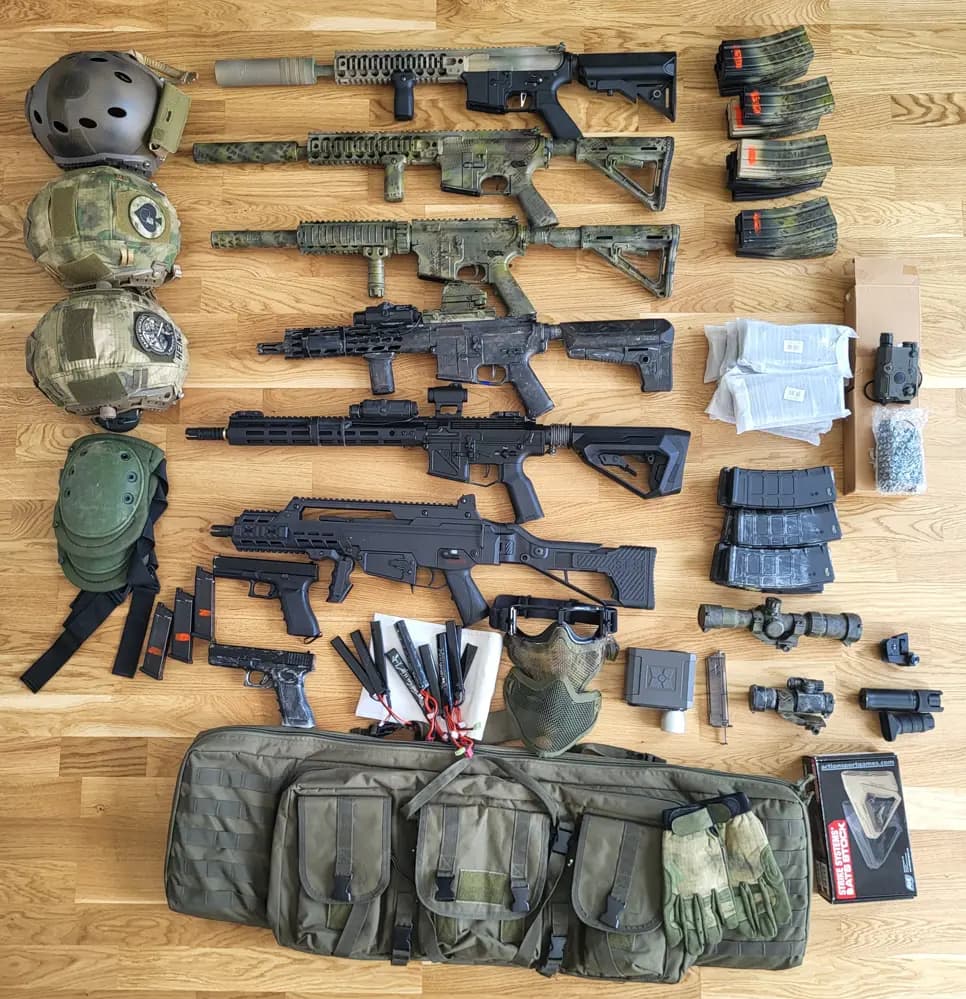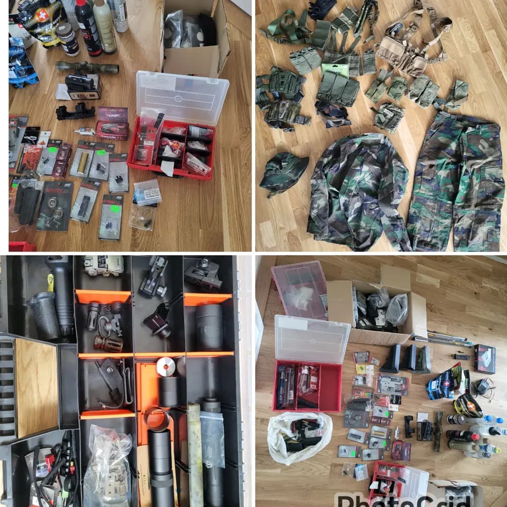 OBS!!!Allt detta förvaras ej hemma och skickas helst inte heller. Vid försäljning möts vi upp eller så tar jag med dom till överenskommen plats.All of this is not kept at home and preferably not sent either. When selling, we meet up or I take them to an agreed location.Stort airsoftpaket som har allt.Köp själv eller till laget.Allt fungerar som det ska och skjuter galet långt och rakt =)Allt är uppgraderat internt på de tre översta m4:orna med allt som kan uppgraderas. Allt i gearboxen har fått det bästa av ultimate samt motorerna är high torque och mosfett såklart. De är flathoppade vilket gör att de skjuter långt och rakt, ni som vet vet =)De tre nedersta är orginal men skjuter magiskt de med.Det är på bild2st lmt defenders 1st G&G1 Krytac1st APS Phantom extremis1st ics G362st glock 1716 metallmagasin 12022 ABS plast 140-1603 g maga3st hjälmar1st sordin hörselkåpor,2st PEQ boxar,Sikten, cronograf ljuddämpare vapenväskaBatterierSkyddsmaskerSnabbladdareExtra stocks till m4.ornaKnäskyddVäst: warrior assault systenms med lätt platta i, div fickor samt vattenblåsaSkjortor 3st : Ops combat shirt, invader gear samt propper, storlek mediumByxor: Propper M/R, Claw gear Medium 50Sedan massor av upgraderingsdelar , kulor, gas kikarsiktenmm, extra magasinfickor, lårhölster, chestrigg mm mmJa det är verkligen allt och lite till och allt fungerar som det ska.