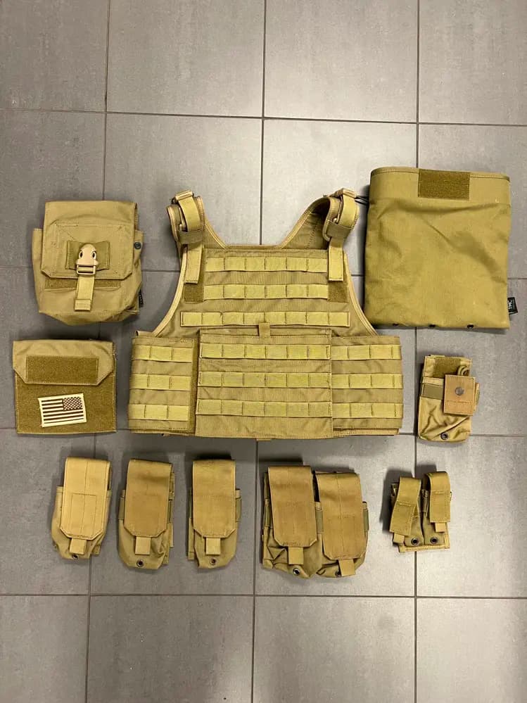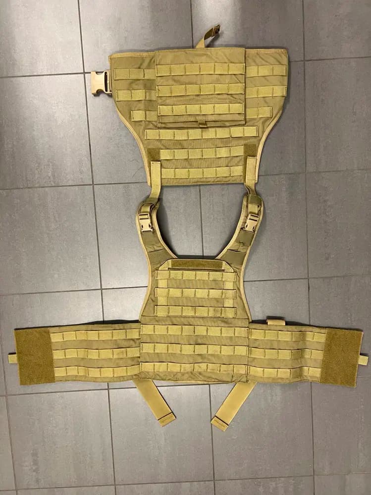 Säljer en Pantac Platecarrier med cummerbund (alltså inbyggt mollebälte). Färg åt tan/khaki-hållet. Storlek Small, men jag är 188cm/90kg och den satt bra på mig. Inköpt beg runt 2012 och använd av mig på nåt enstaka spel bara. Bra skick förutom en litet skärmärke i en av "molleöglorna" ( 3 raden uppifrån, 2a öglan från vänster i bild). Plats för plattor fram, bak och på sidorna (inga plattor ingår).Följande fickor ingår: 1st admin pouch. 1st dubbel pistolpouch. 1st dubbel magppouch för M4-mag (rymmer totalt 4 mag). 3st single M4 pouch (rymmer 2 mag styck). 1st radioficka. 1st drop-pouch med avklipp lock (snörning i toppen hindrar maggen från att ramla ut).1st utility pouch med lock. Även känt som M249-pouch om jag inte minns fel. Prisidé 500 eller bud. Kan skickas eller hämtas i Stenungsund. Hälsningar Jonas