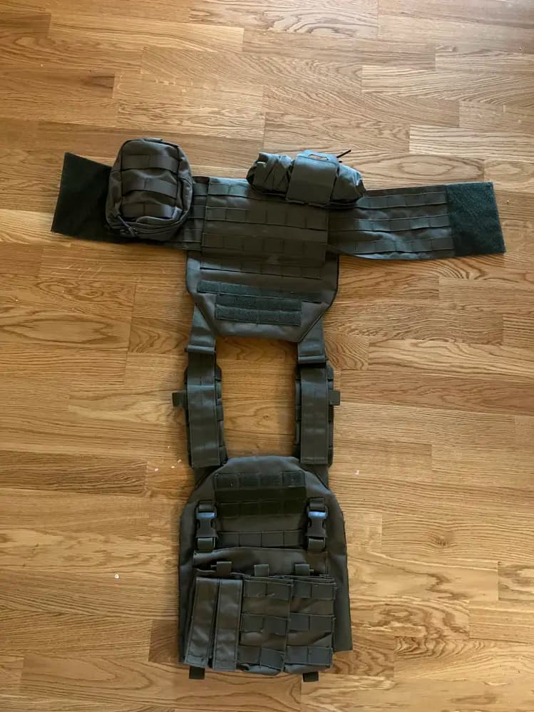 Grön plate carrier med extra fickor och magdump, finns mer fickor jag bara har tagit fram ännu men visar gärna om en vill sePruta gärna! Priset är inte satt i stenFrakt diskuteras