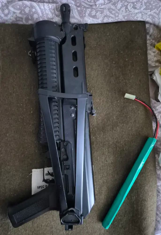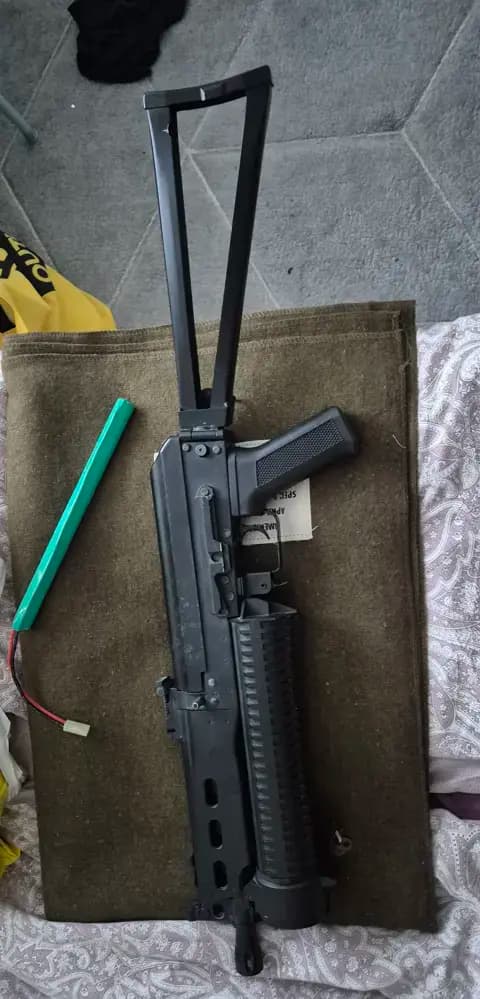 Detta är en PP-19 Bizon, närmare bestämt en airsoft-replika av den ryska k-pisten.Vapnet på bilden är en eldriven airsoft-modell (AEG) som drivs av det gröna batteriet som syns ovanför. PP-19 Bizon är känd för sitt karakteristiska heliska magasin som sitter under pipan och rymmer en stor mängd skott, samt sin fällbara kolv som gör den mycket kompakt. Egenskaper och märkenModell: Baserad på AKS-74 och delar många delar med AK-familjen.Tillverkare: Populära airsoft-tillverkare av denna modell inkluderar CYMA (modell CM.058) och Golden Eagle.Konstruktion: tillverkad helt i metall eller med delar i stål för en realistisk känsla.Magasin: Det unika runda magasinet kan rymma allt från ca 160 till 1200 kulor beroende på typ (mid-cap eller hi-cap).
