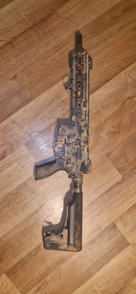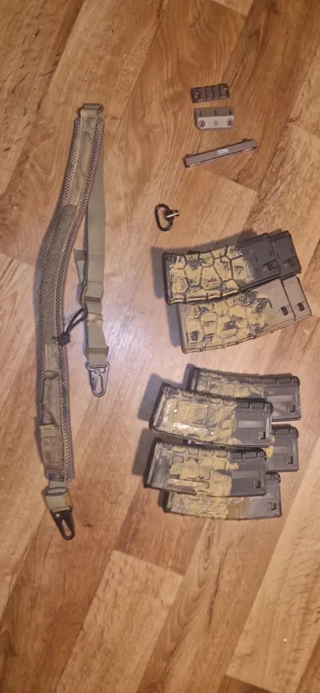 -Specna Arms h11-- MadBull Black Python 6.03-- Mapfle 70 Rubber -- Gearbox is stock -- HAO SMR Rail bronz-- unknown Muzzelbreak -- PTS EPS Stock -- cheap plastic Sights -- QD Backplate -- changed the Ambi mag release button to single The paintjob is done with Schlämmkreide, wich will naturly wear down faster the spray paint and can be removed with hot water and some scrubbing. What would be included:+ 4x VFC QRS Mag + 1x Quick Release Sling Swivel+ Helikon-Tex Carbinsling + 3x Mlok rail adaptor (2x short, 1x long, 1 short and the long one is mounted) + 1x Mlok light mount + 1x HAO's 45° torch low-profile mountThe rifle is a bit over a year old and hasn't been fielded that much. Works like charm. Can send video of function on requestThe 5 pmags (noname) are no longer part of the s ell and are not included