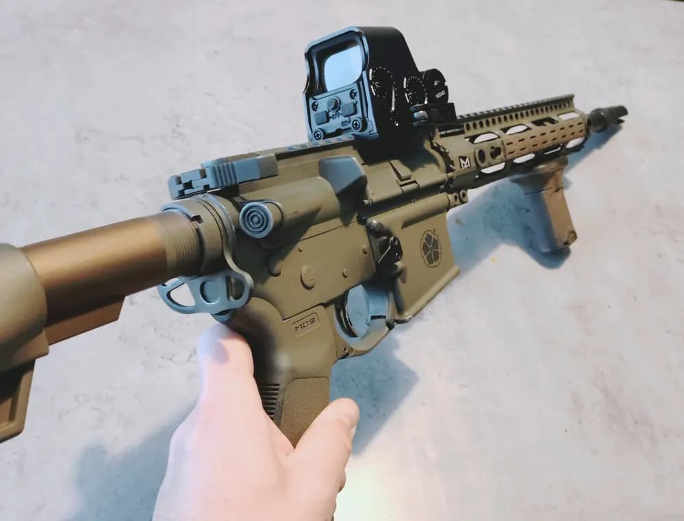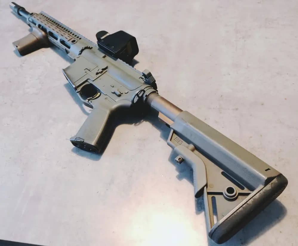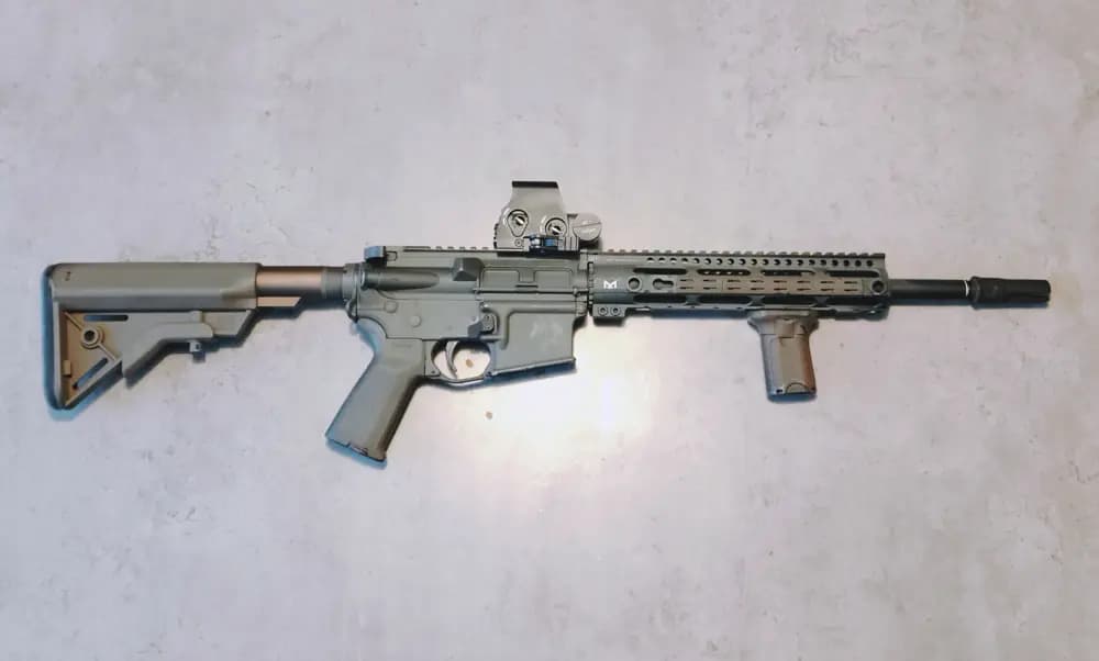 Internals: Oklart, då den köptes second hand men rullar Externals: RS BCM kolv, MLok covers, front grep, pts pistolgrepp, airsoft holo sikte.