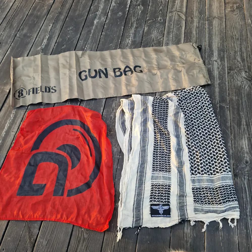 Vapenpåse (8-fields) ett litet hål finns, deathrag (har fransat sig något) och en shemagh (invader gear).Begagnat men i gott skick.(Katt finns i hemmet)