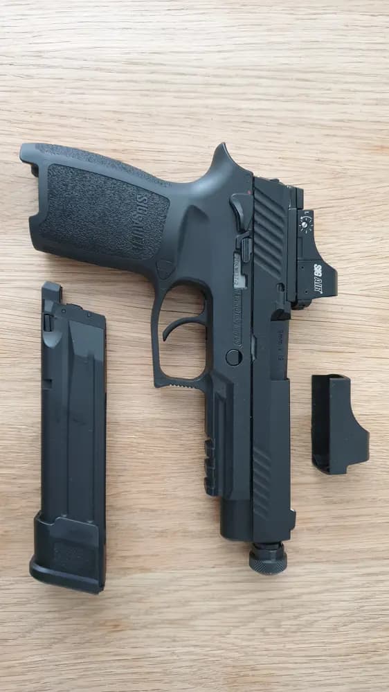 Pistolen är i mycket fint skick, 9-10. Pistolen är uppgraderad med maple leaf crazyjet inner pipa. Gängad ytterpipa med adapter för tracer och en snygg flash hider. Original airsoft Sig Sauer red dot sikte är monterat, ger en klar röd punkt. Glaset är fint utan skador. 1st magasin, långa varianten medföljer, co2.
