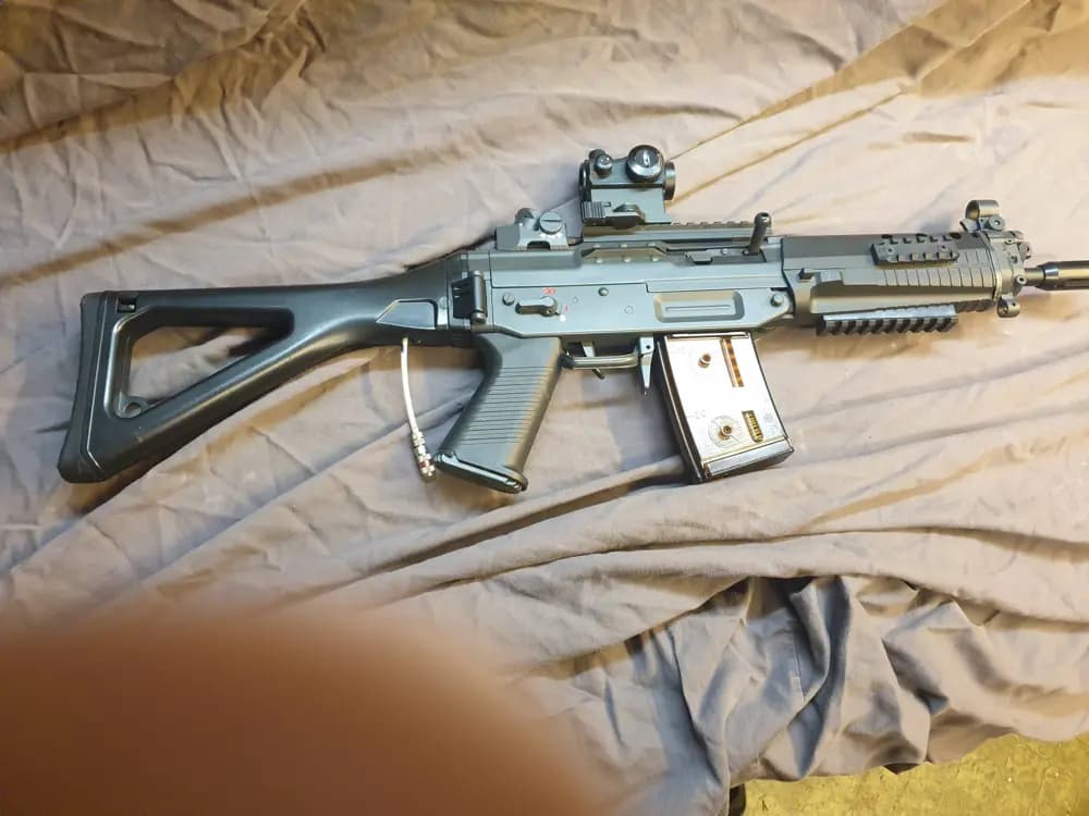 SIG SG-552 CommandoHPA modifierad med special snabbkoppling 4mm slang ,säljes i befintligt skick ,ingen garanti ,fullt fungerande ,siktet ingår ,Wolverine Inferno motor.Köparen betalar frakt ,kontakta för vidare info
