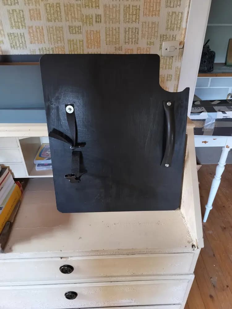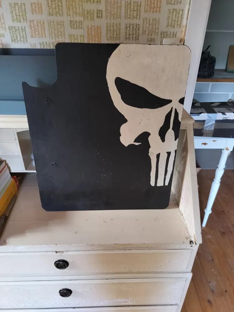 Mindre sköld säljes:Hemmagjord i 6 mm plywood.Ursågad i ena hörnet för pistol etc.Höjd: 50 cmBred: 42 cm
