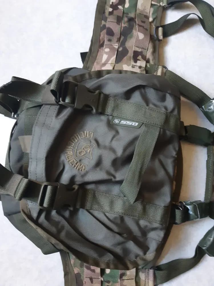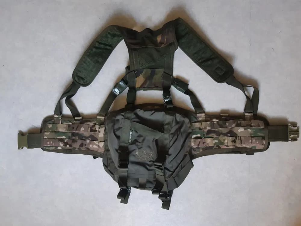 Består av SSO molle smersh bältet i multicam och buttpack. Hängslen är brittisk överskott som sitter bra.