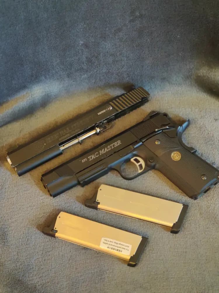 Info:Airsoft M1911 pistol av STI. Skjyter 6mm airsoft plast bbs och drivs av greengas.Sitter bekvämt i handen och kickar fint.Medföljer en extra slide i längre format med COLT märkning som passar fin fint om man vill byta.Trimmar 80m/s 0.87J med mina .28g bbs och "power gas". Så jättebra för korta distanser eller inomhus spel.Modifiering:-rengjord-smörjdAnmärkningar:-korta sliden saknar frontsikte, ett nytt skulle behöva limmas fast då fästet är bredare än original då gamla frontsiktet knäcktes av.-långa sliden saknar rekylfjäder, baksikte och nozzle assembly.Ingår:x1 pistolx2 magasinx1 lång okomplett slidex1 originalkartong med manual och pappers måltavla