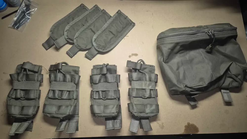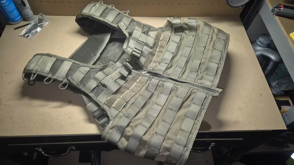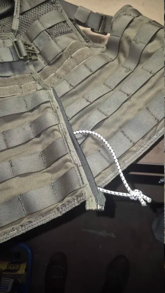Snigel Design, Stridsväst 12 som används i ~2 år och har fungerat väldigt väl. Inga större skador, men har en lagad dragkjedja där sömerskan vänt dragkjedjan åt fel hål (se bild). 500 kr